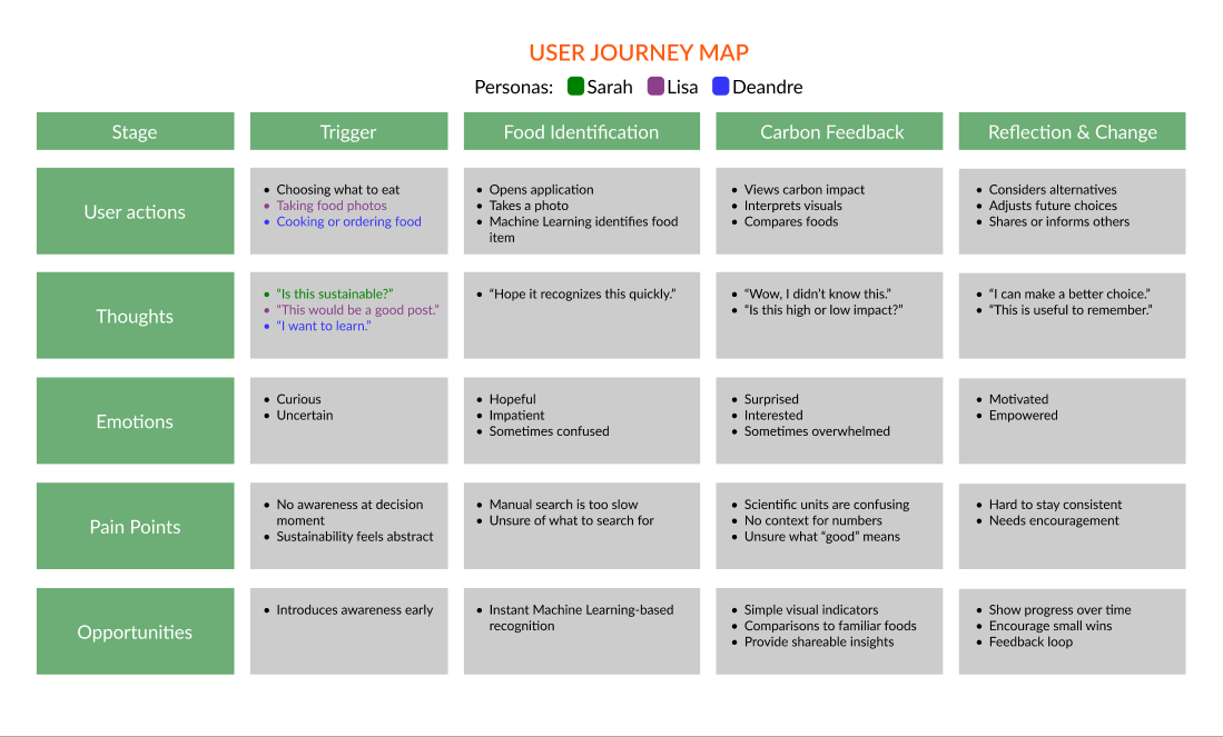 To guide our design decisions and ensure we were addressing real user needs, we created three personas representing individuals who care about the environment but lack a deep understanding of how their food choices contribute to climate change. These personas helped us stay focused on user motivations, behaviors, and pain points as we mapped out the product experience.